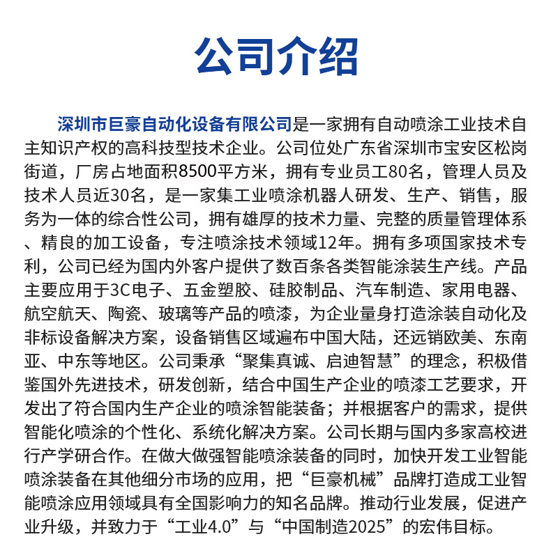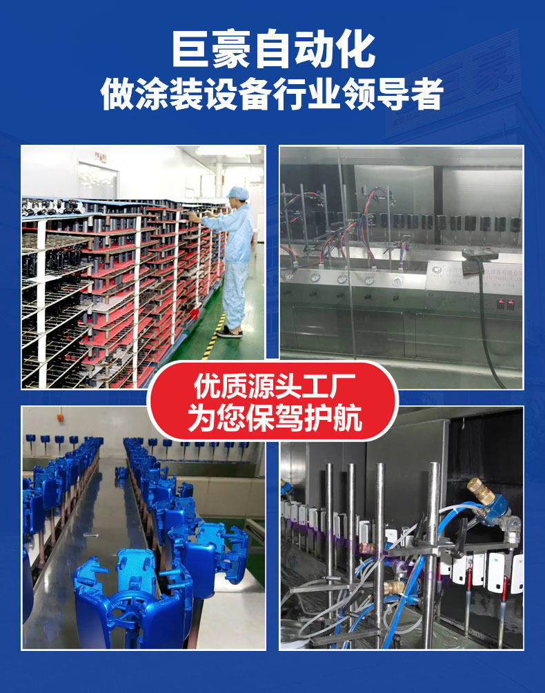 深圳市巨豪自動(dòng)化設(shè)備有限公司致力于整廠自動(dòng)化涂裝設(shè)備和輸送線設(shè)備的研發(fā)和制造,現(xiàn)有產(chǎn)品包括:硅膠按鍵噴涂生產(chǎn)線, 烘干設(shè)備,吊空輸送線,滾筒線,鏈板線,裝配流水線機(jī)器人自動(dòng)噴涂、往復(fù)噴涂機(jī)、智能多軸往復(fù)平面噴涂線、固定槍自動(dòng)無塵噴涂線、手動(dòng)無塵噴涂線、五金液體(粉末)噴涂線、電子煙及鋼筆自動(dòng)噴涂線、廢氣處理系統(tǒng)、廢水處理系統(tǒng)、環(huán)保處理設(shè)備及萬級(jí)無塵凈化車間工程;同時(shí)還配有烘干、UV光固 、沖切、溶劑回收循環(huán)設(shè)備、自動(dòng)物流系統(tǒng)、涂裝配件及周邊耗等 。...
